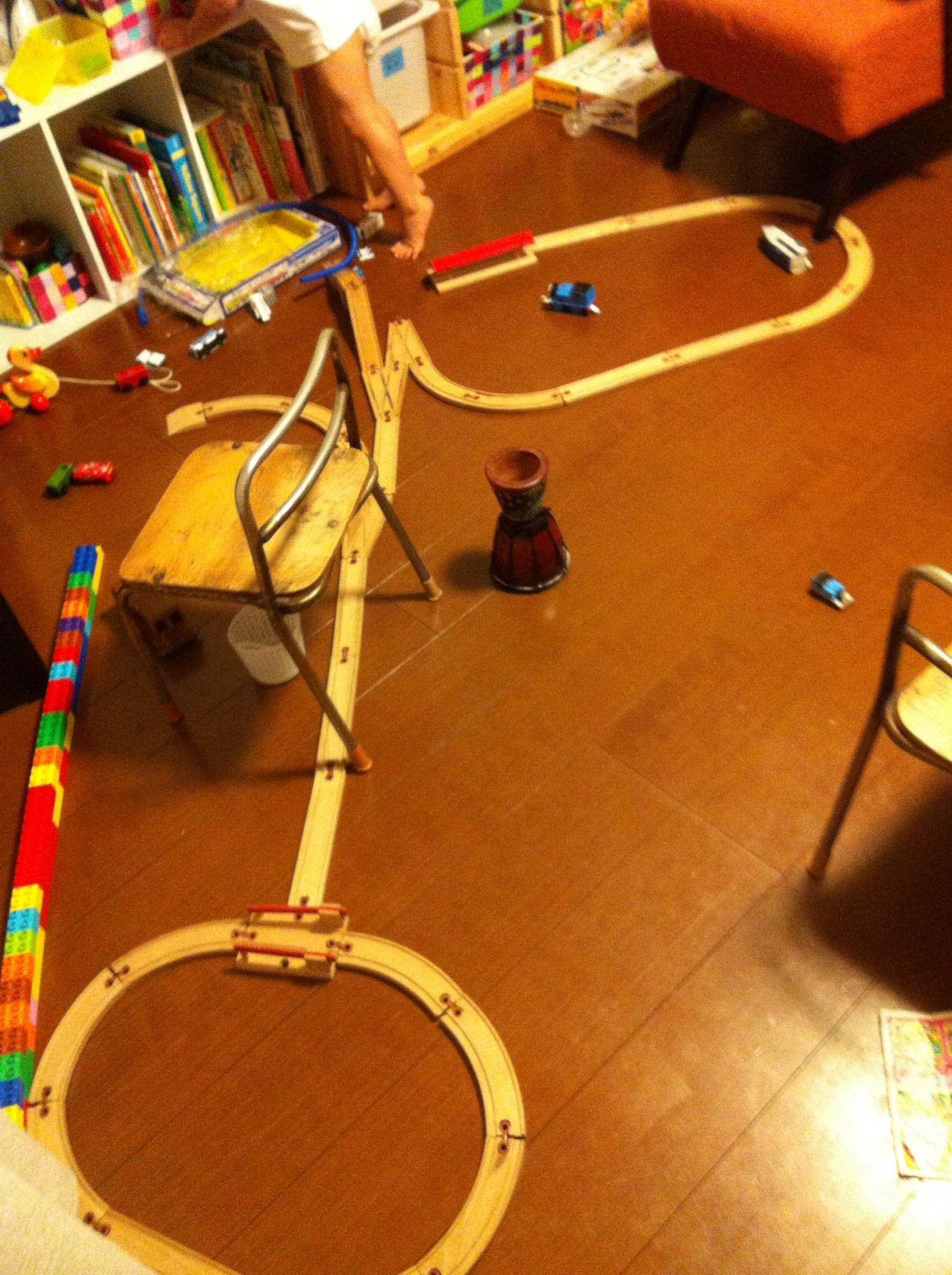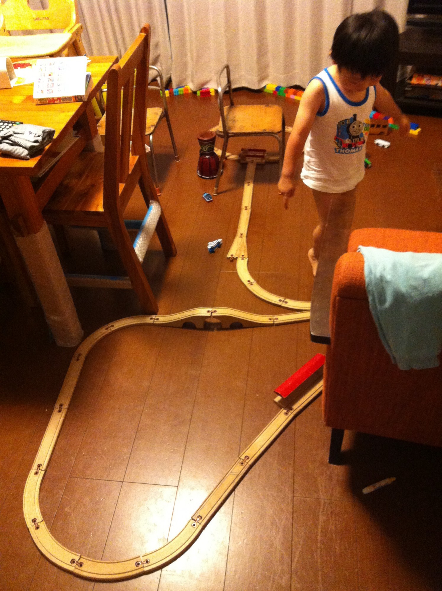 2015年7月7日 線路名人改め 毎日飽きもせずに線路をつないでは、トーマスたちを走らせています。 線路のかたちがどんどん進化しています。 わたしにはとうてい思いつかない形で、本当に感心します。 こども椅子付近のまるくなっているところがポイントと思われます。 逆向きから。さっきと少し形をかえたようです。 なんのこっちゃわからない不思議な形。 分岐やトンネルをうまく利用しています。 めずらしく始点と終点以外はほぼつながっています。 もはやアーティスト。