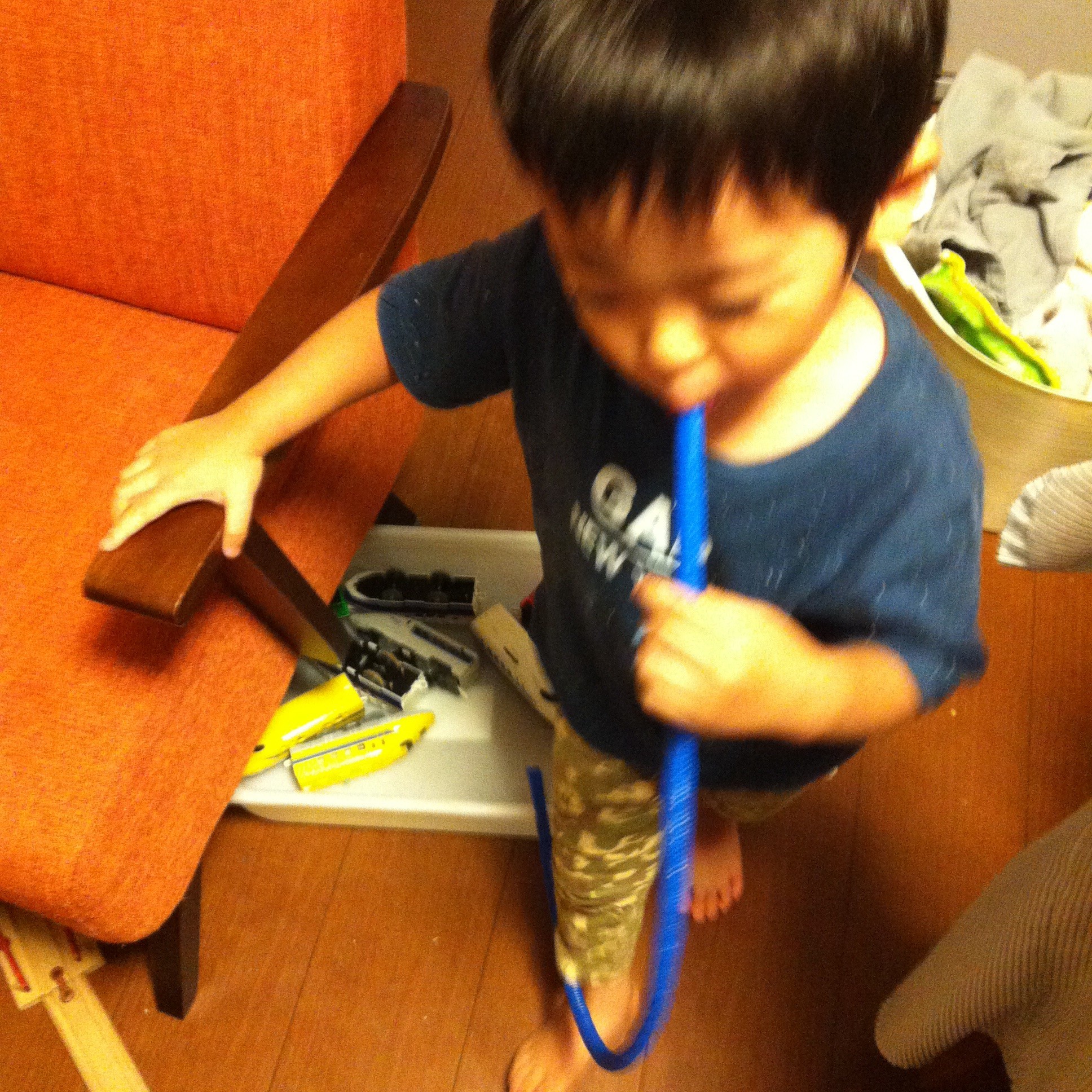 2015年9月2日 ディジュリドゥ 5月くらいからトーマスにはまり、トーマスばかり見ていたのですが、 あるタイミングでなぜか、テレビはまたアンパンマンを見るようになりました。 先日、ドレミファ島のなんちゃらみたいなお話を見てから 「いっしょにどれみしよ~」と、家にある楽器系のおもちゃや、楽器にみたてたおもちゃで遊んでいます。 プールに空気を入れるホースを吹くのも気に入っており、 ディジュリドゥのような音を奏でています。