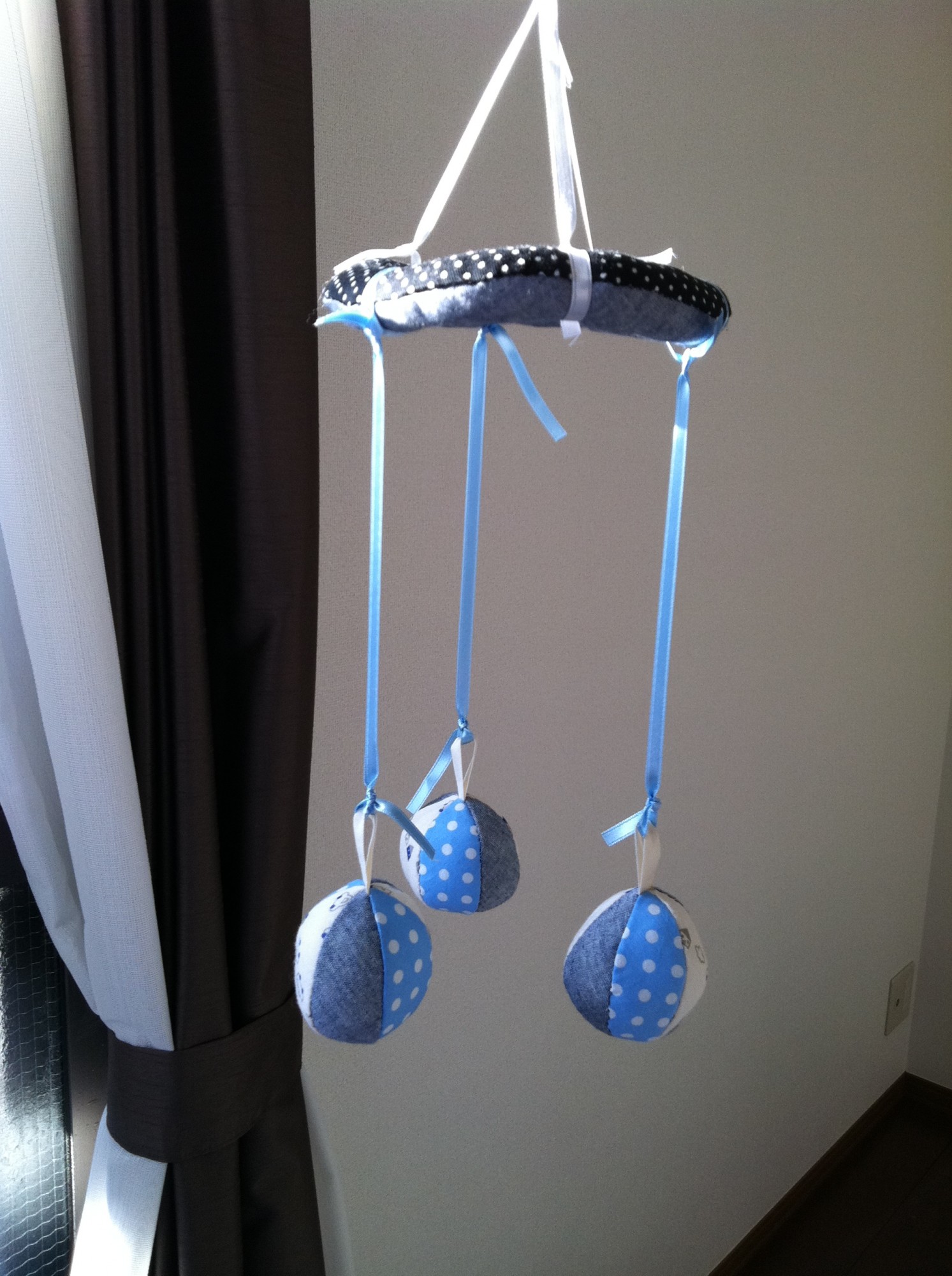 2014年10月5日 ベッドメリー 赤ちゃんのお世話の合間に、いきあたりばったりでつくったものです。 あまり上手に作れなかったのですが、苦労したので思い入れがあります。 写真には写っていませんが、 上にtrousselier のベッドメリー用のスペアオルゴールがついているので、ちゃんと回って音も出ます。 ハンドメイド