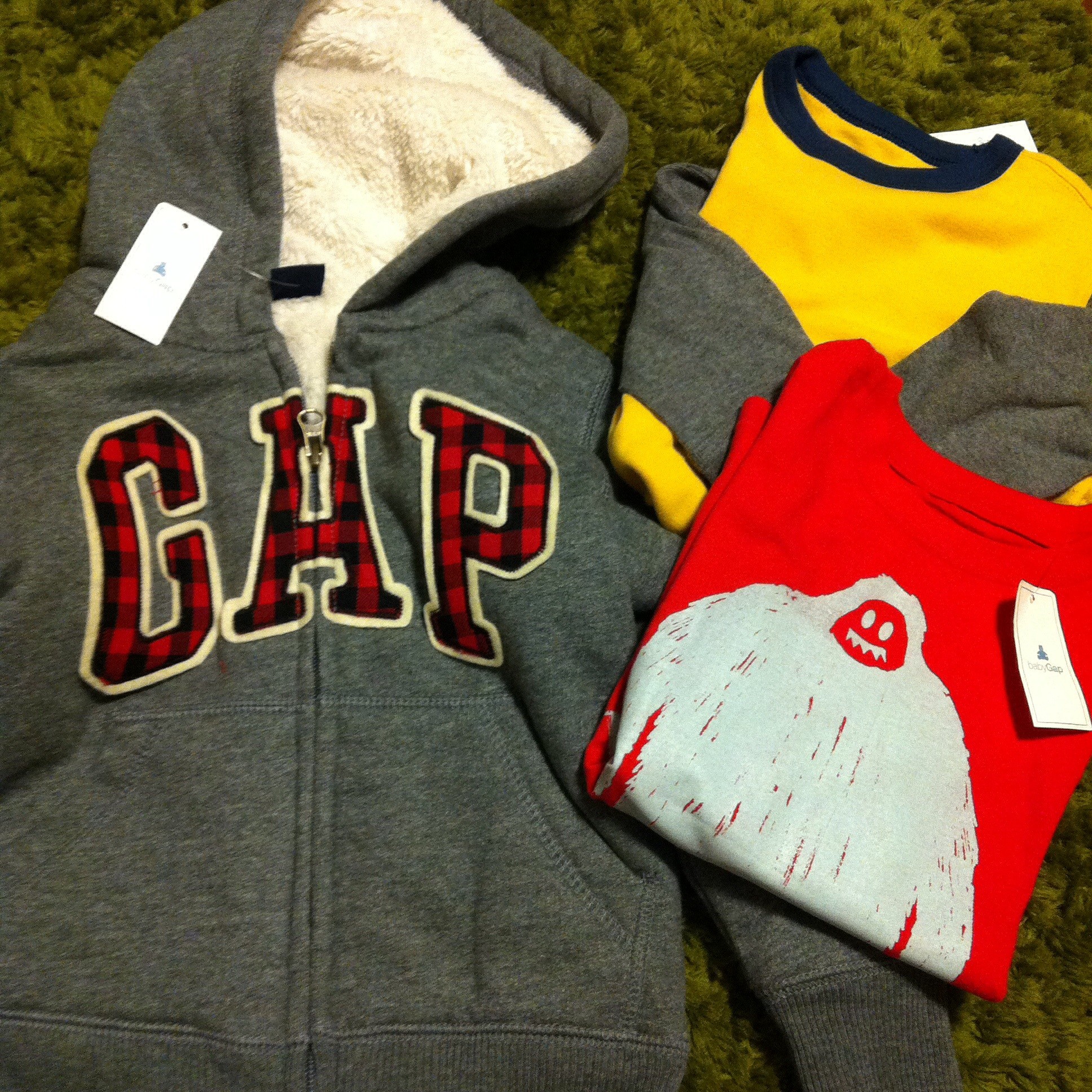2015年12月14日 GAPデート いろいろタイムリーに更新できてませんが、先々週末、息子とGAPに行きました。 といってもおもちゃ屋さんからなかなか動いてくれず、なんとか着いてきてもらったのですが、 試着しているうちに本人もちょっとノッてきたみたいで、 「うーんこっちはどお?」とか「これもかわいいよねぇ」とか言ってました。 右上の黄色いロンTは息子がはじめて自分で選びました。 後日着てみたところ、なかなか似合ってました◎