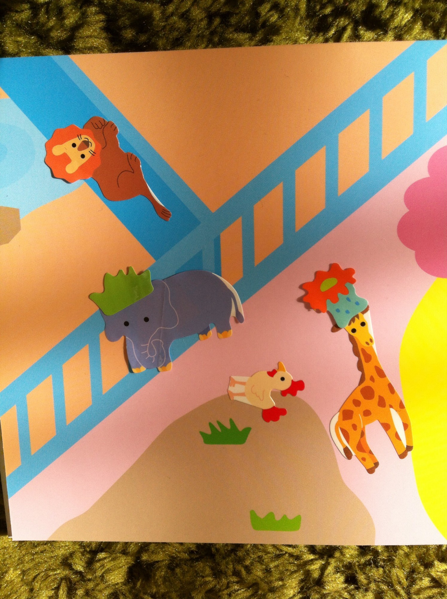 2015年1月15日 シール遊び進化系 シール遊びに少し変化が。 お魚さんににご飯を食べさせてあげたり。 (海藻=ご飯とのこと) 動物さんに帽子かぶせてあげたりしてます。 (葉っぱのシール=帽子とのこと)