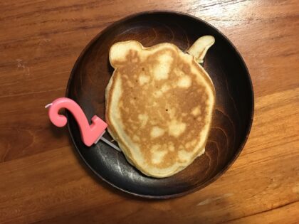 お誕生日のお祝いには、パパの案でホットケーキを焼きました。