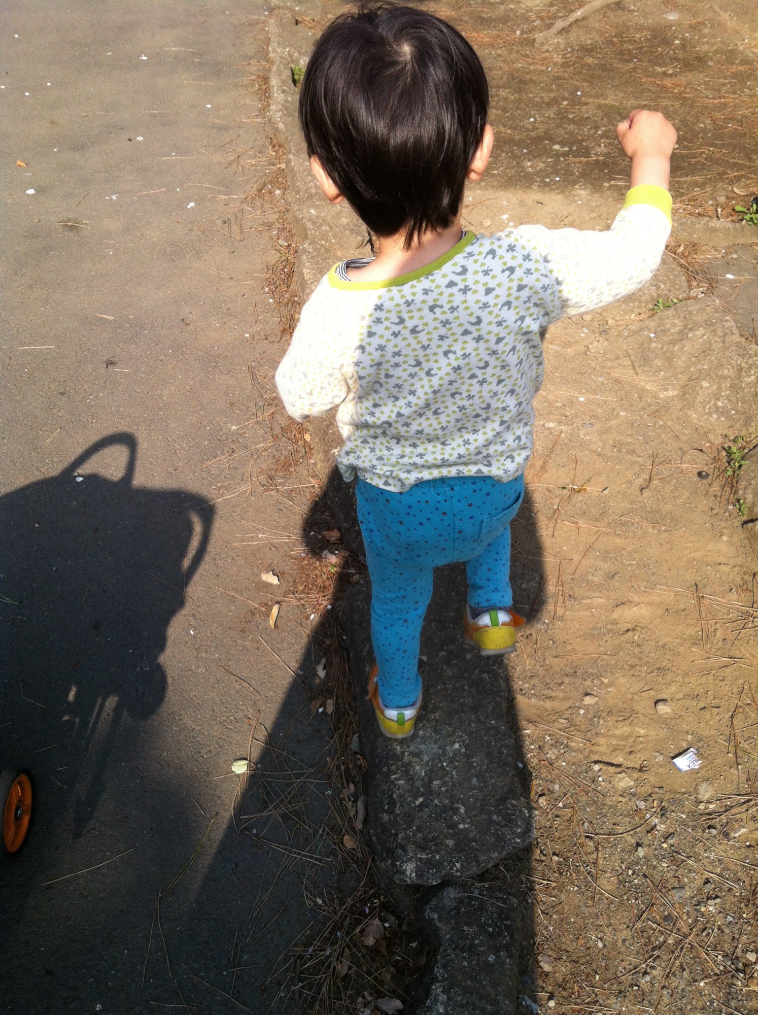 花壇の端の、ちょっとふぞろいの大きな石段のところを歩いています。